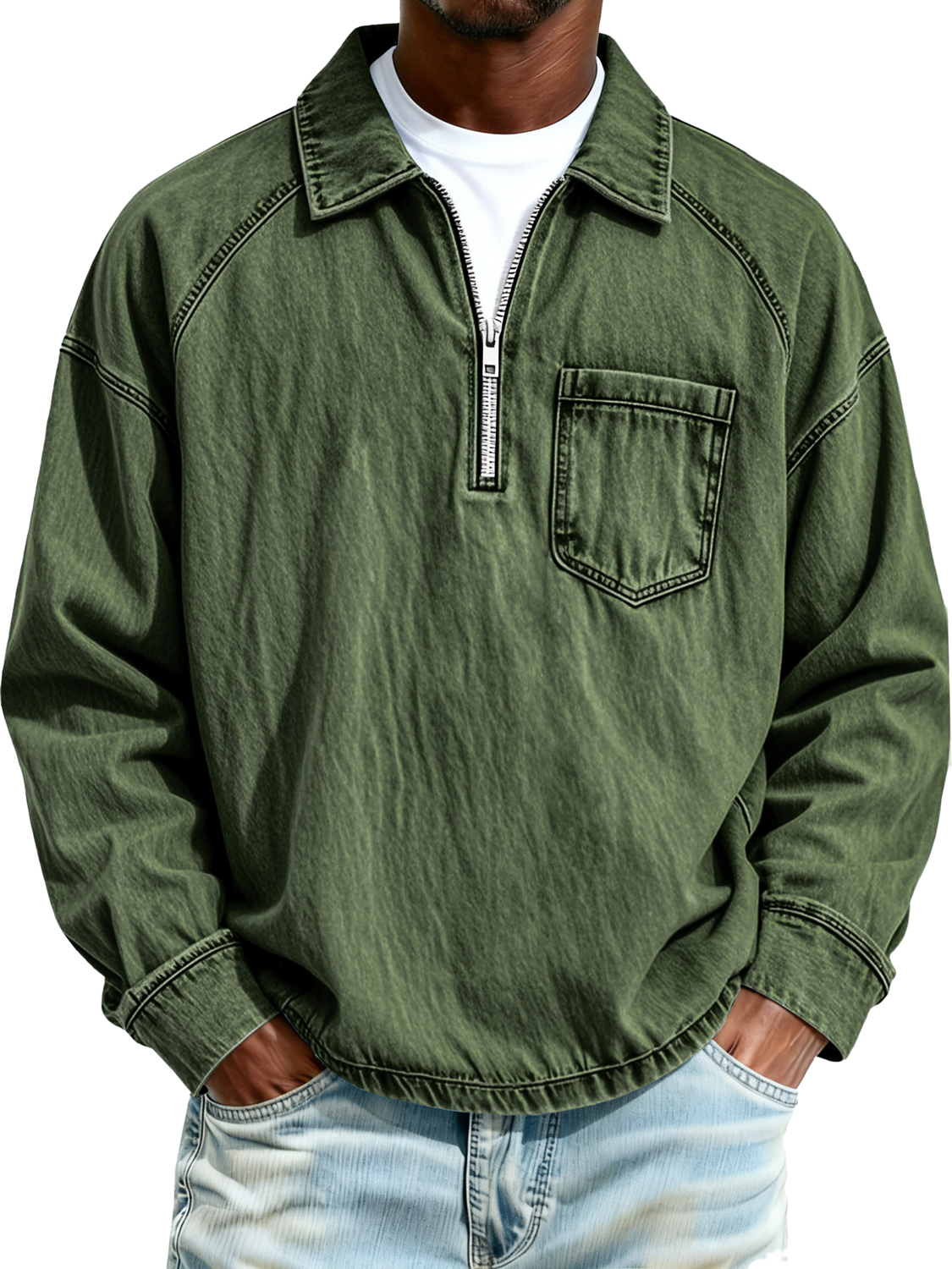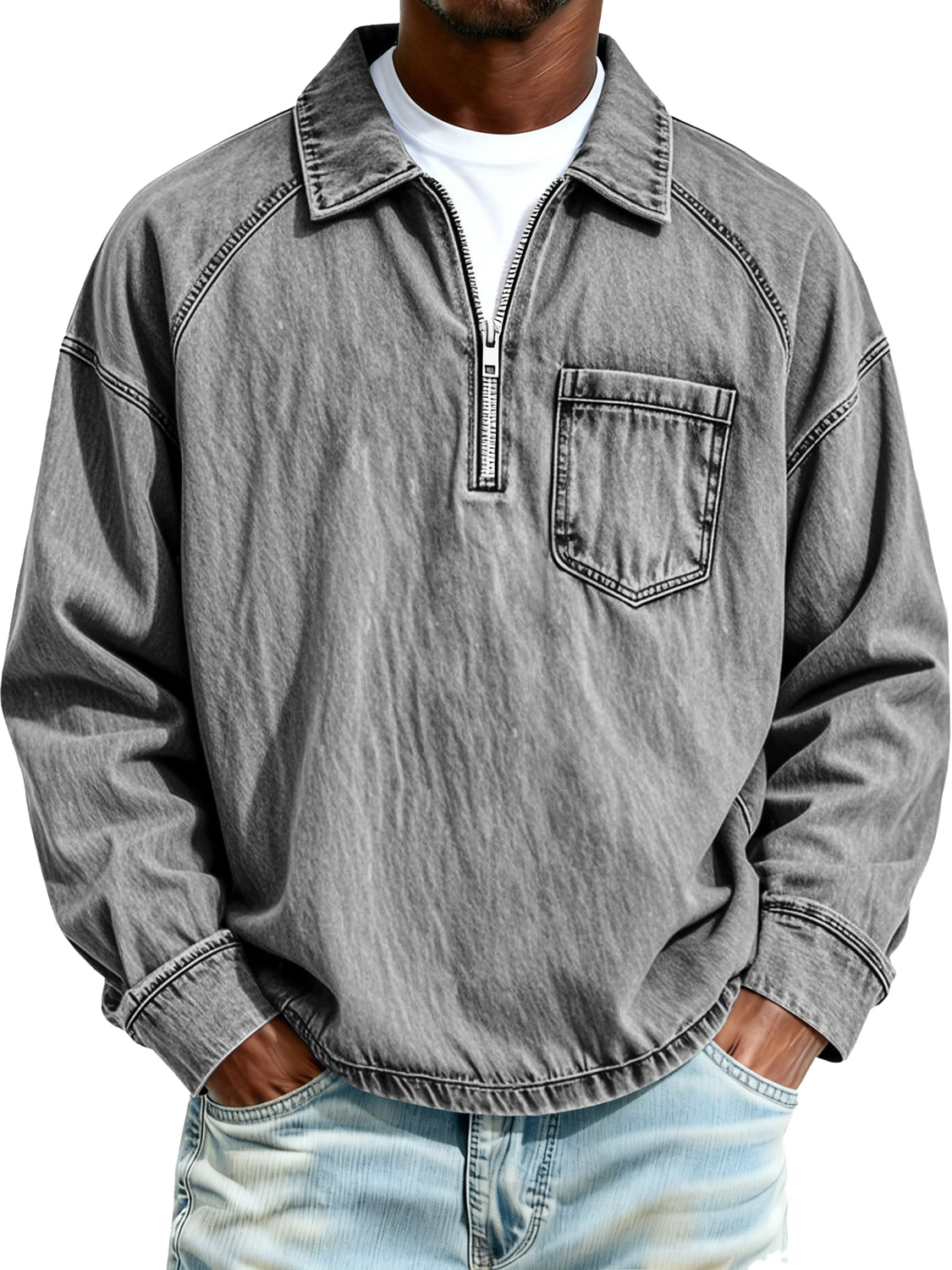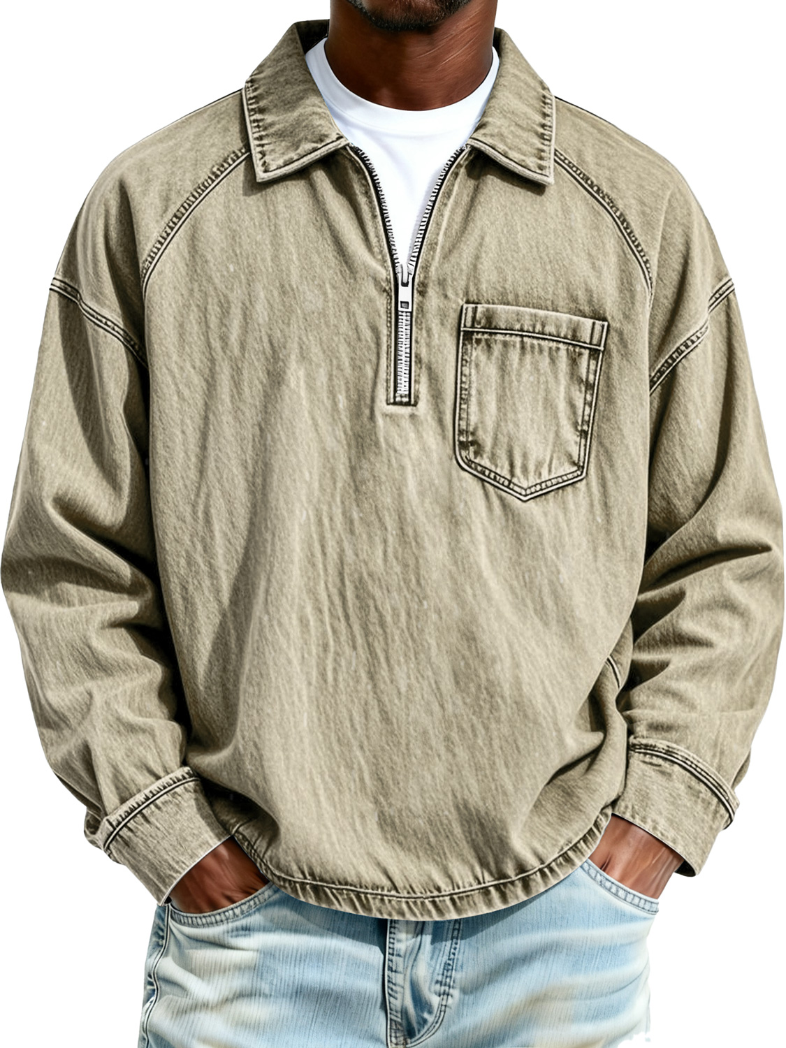 Men's Retro Raglan Collar Zipper Casual Pocket Long-Sleeve Polo Shirt