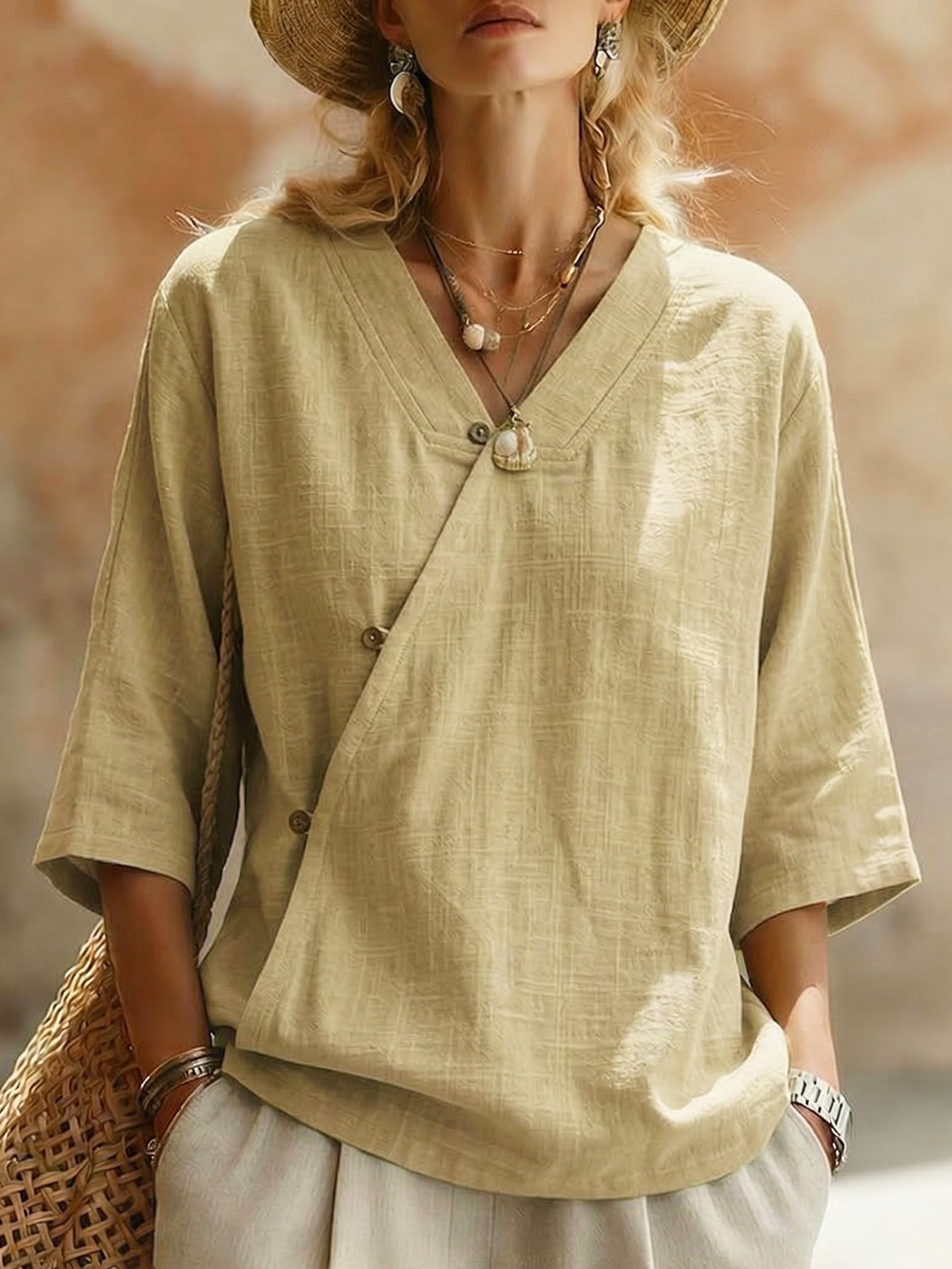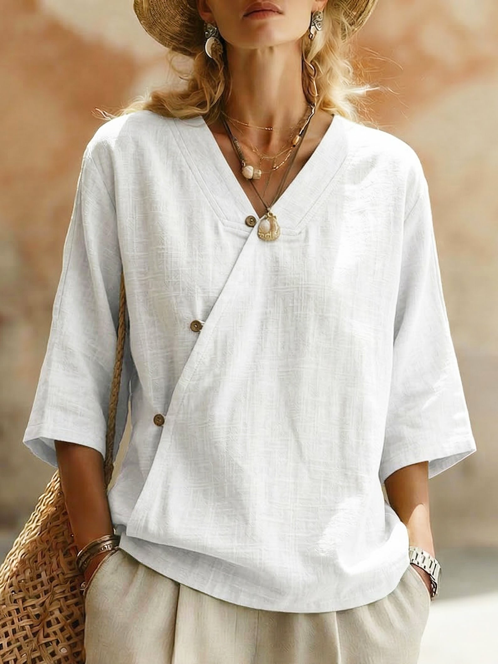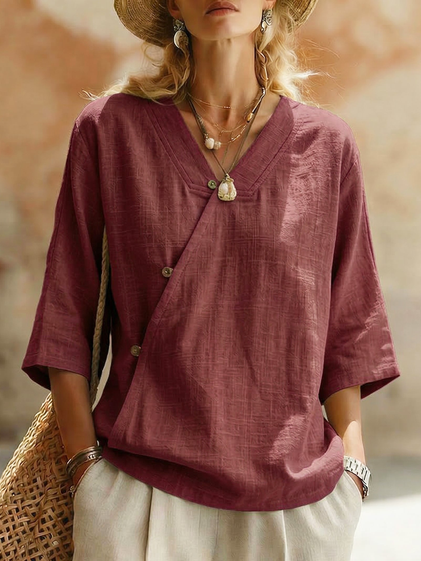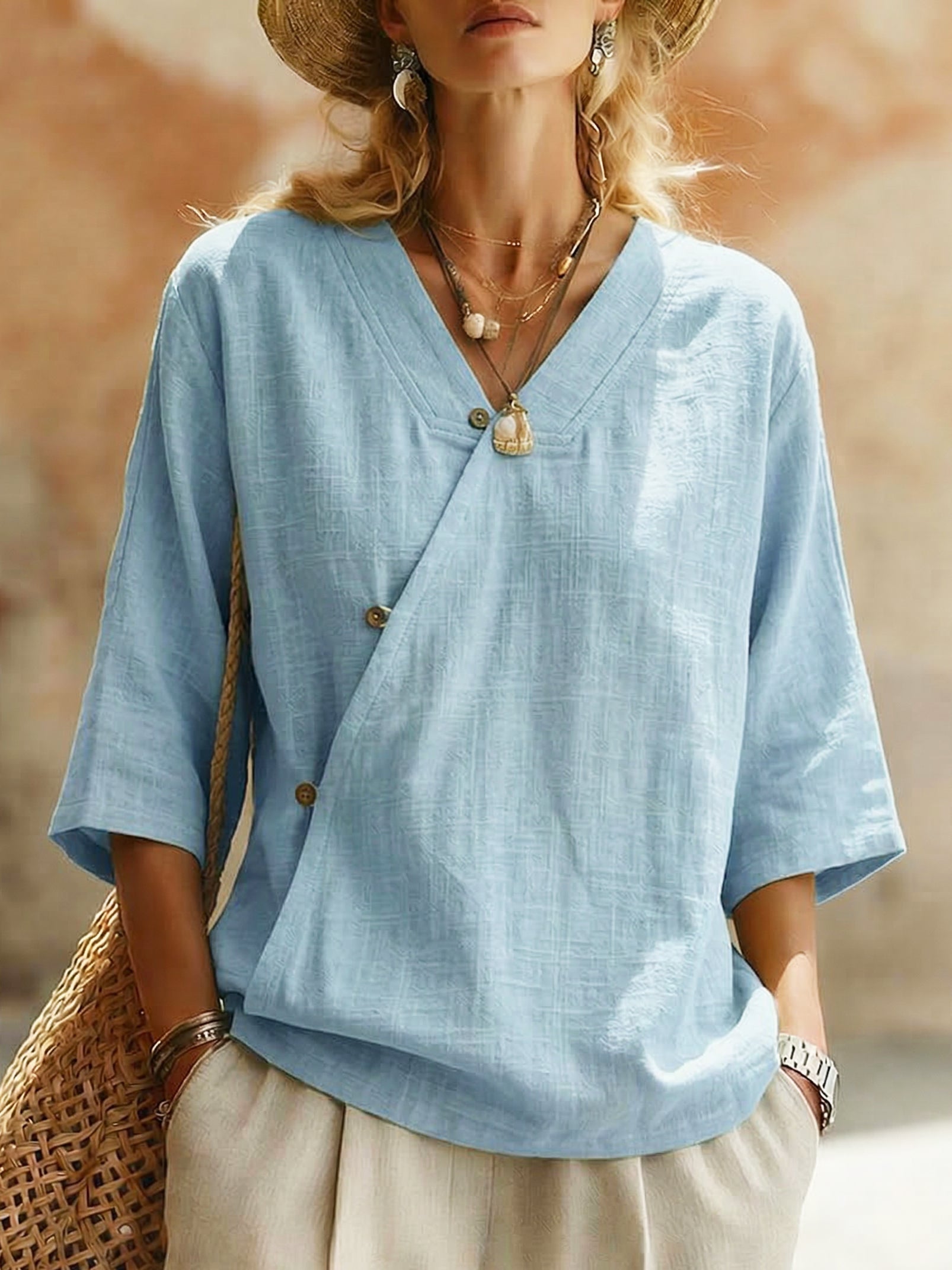 Casual V-neck Button-front Cotton-linen Blouse