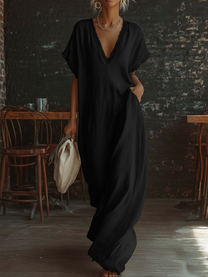 Elegant Cozy Lace-trimmed Loose Linen-cotton Maxi Dress