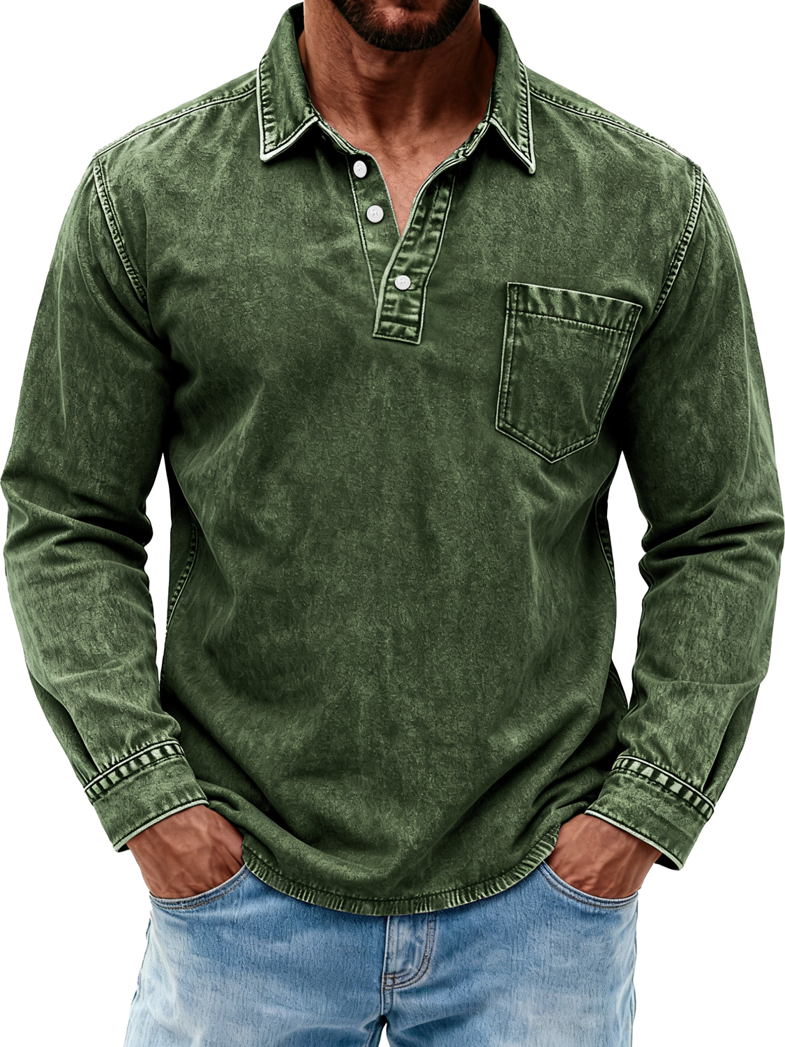 Men's Retro Washed Casual Polo Shirt with Turn-Down Collar and Buttons