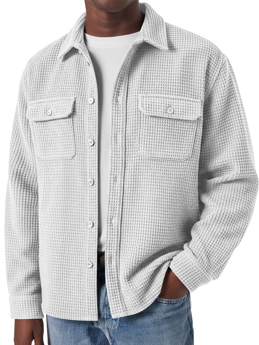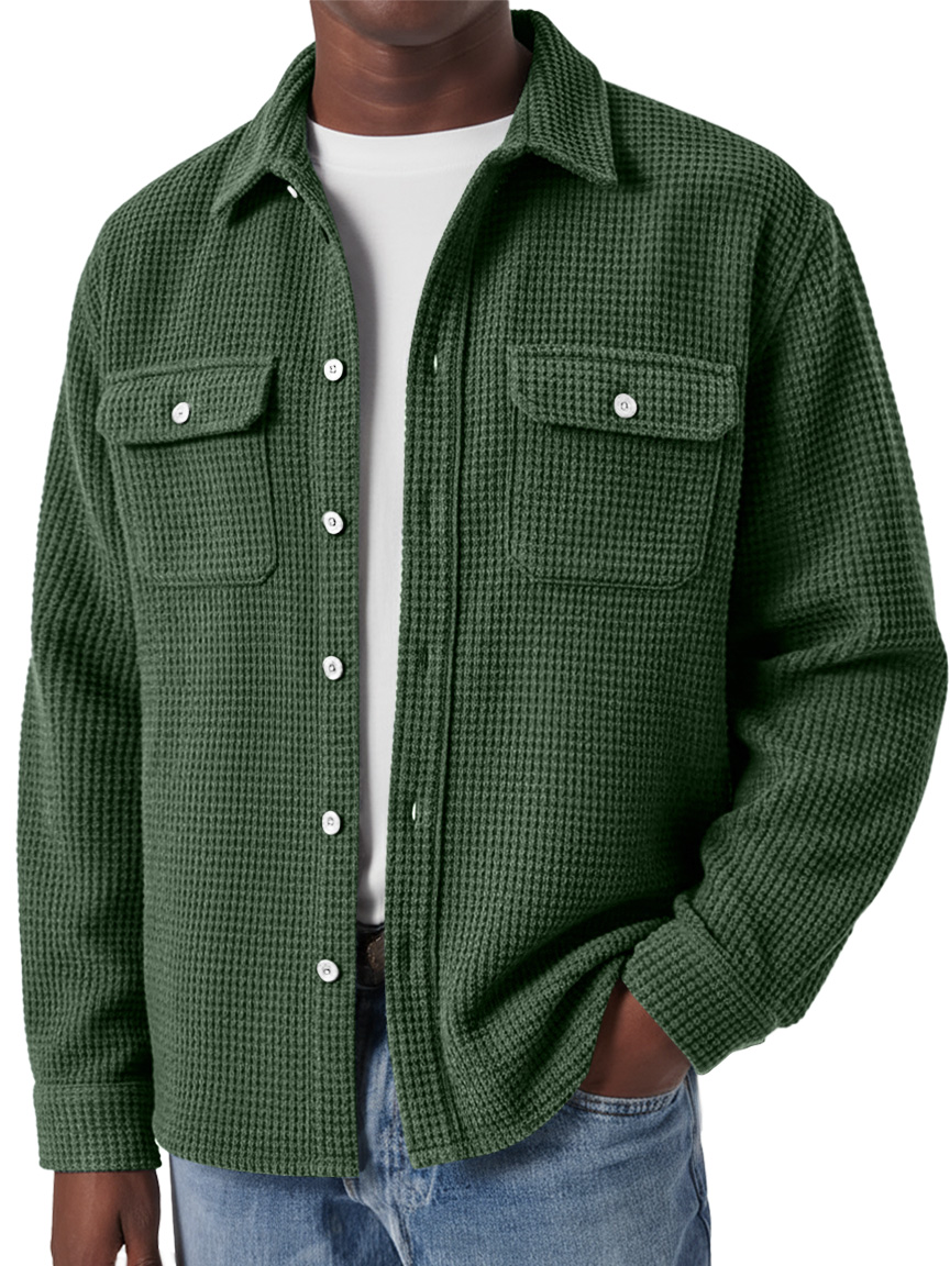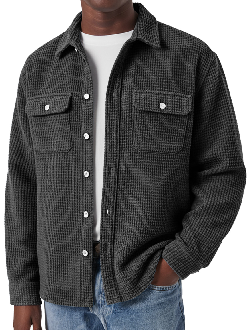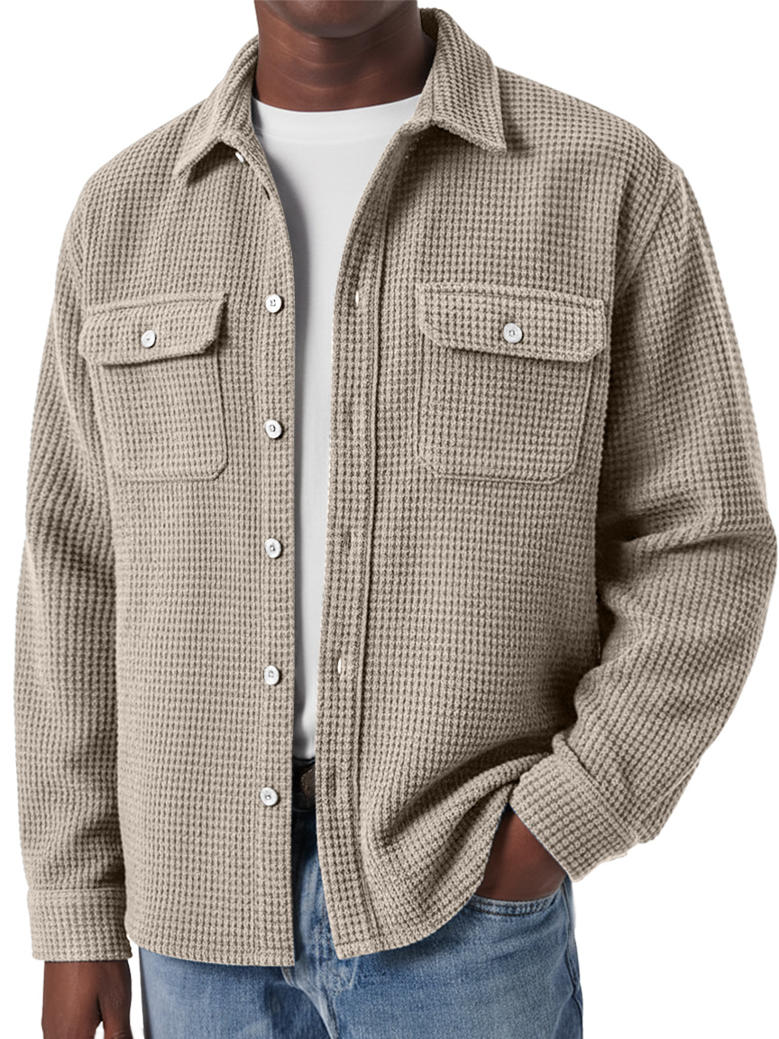 Men's Retro Waffle Double Pocket Casual Loose Long Sleeve Shirt