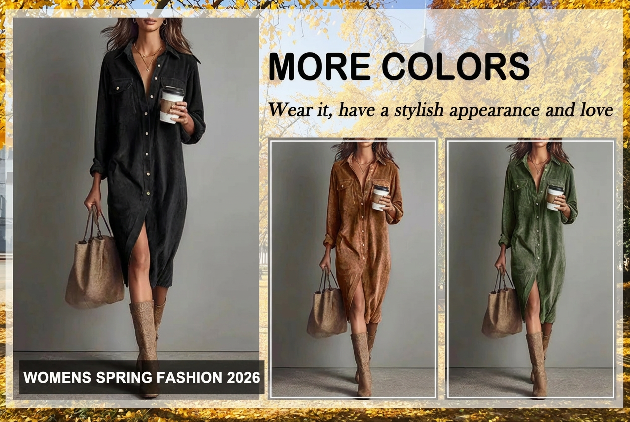 This Women Corduroy Polyester Button Down Midi Shirt Dress is designed for adult women and intended for everyday wear. The dress is made from corduroy polyester fabric, offering a textured surface and structured feel suitable for regular use. It features a front button-down closure and a classic shirt collar for a clean and practical design.